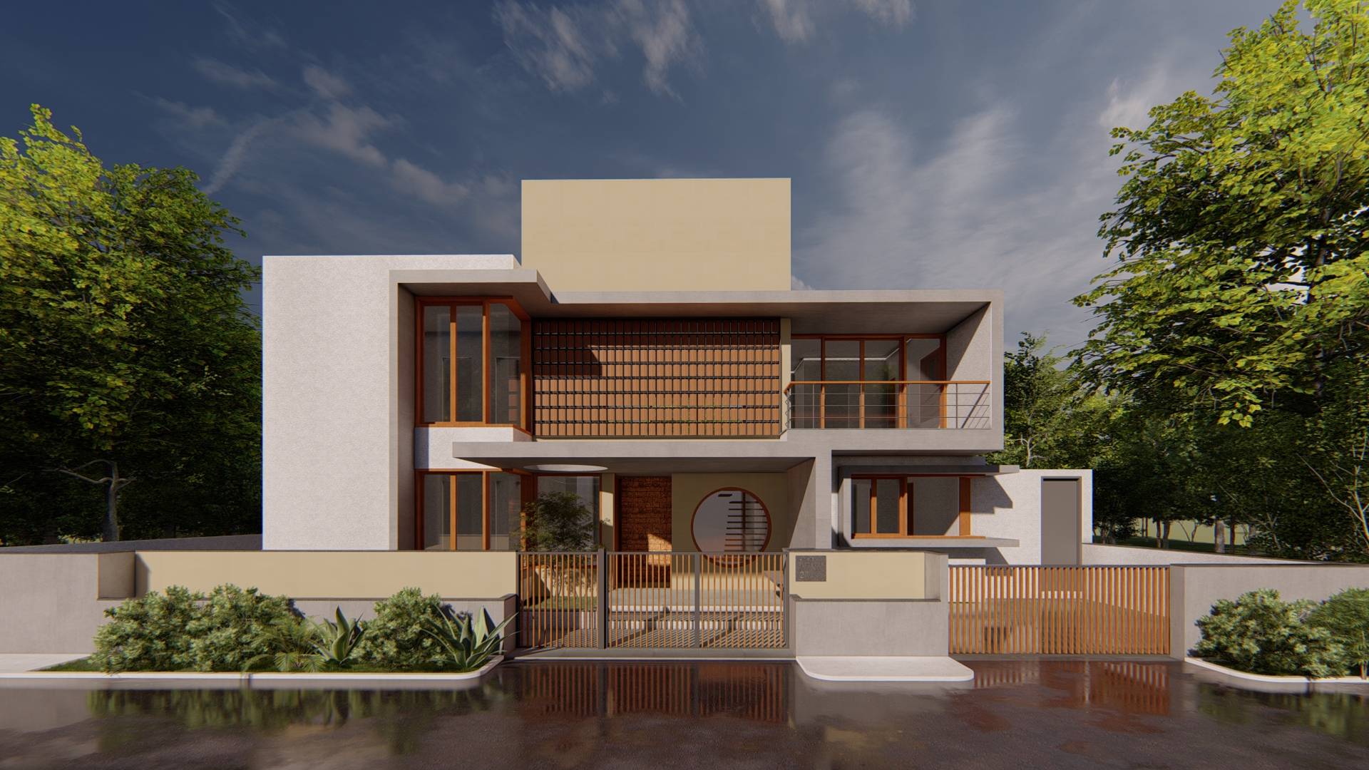 The facade features large, floor-to-ceiling windows that allow abundant natural light to filter into the interior spaces. The facade of family area on first floor is designed as a wooden screen procured locally.