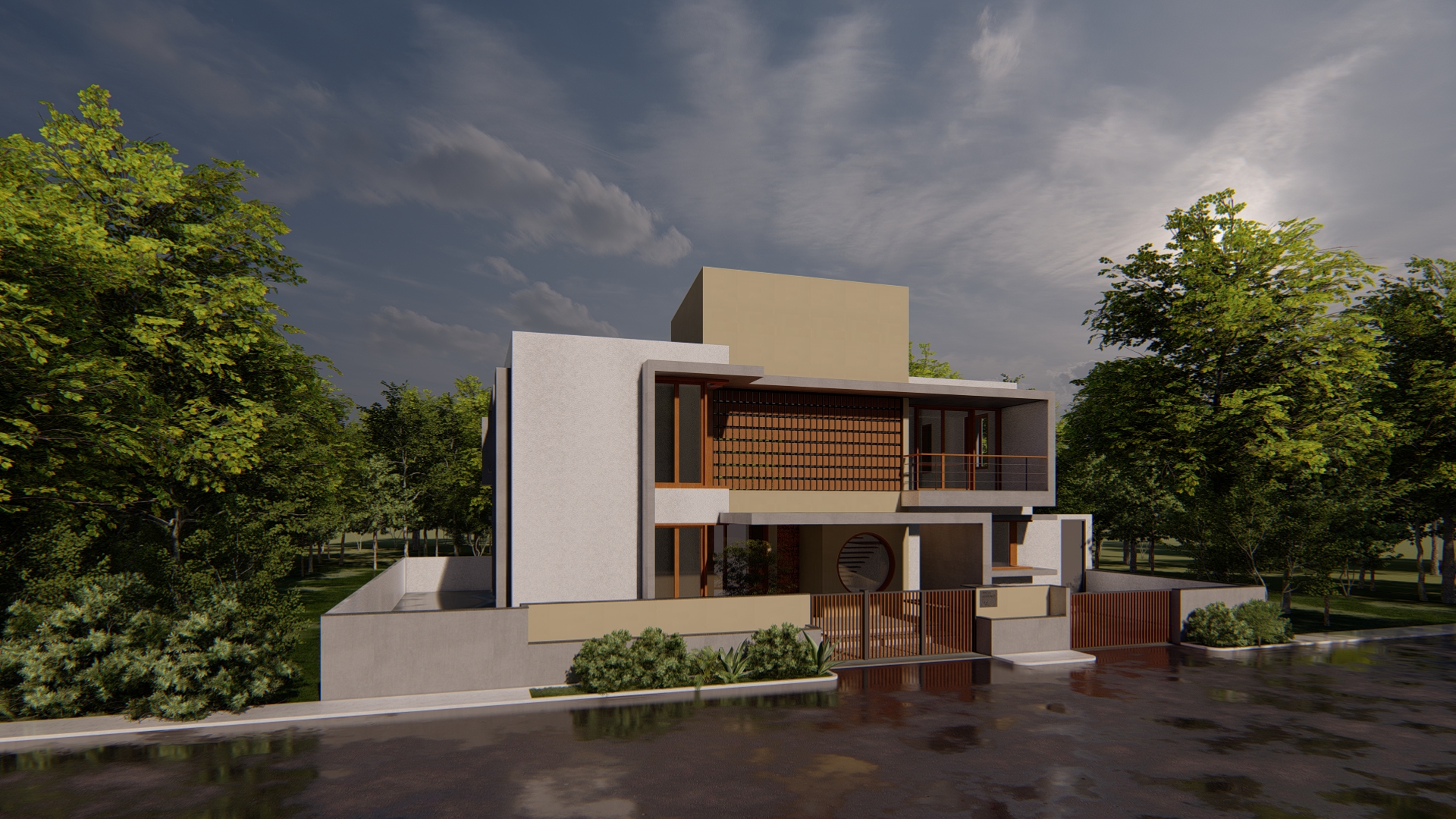 The house is designed with a unique facade that combines the elements of screens and balconies. The exterior of the house is a harmonious blend of sleek lines, contemporary materials, and functional design.
