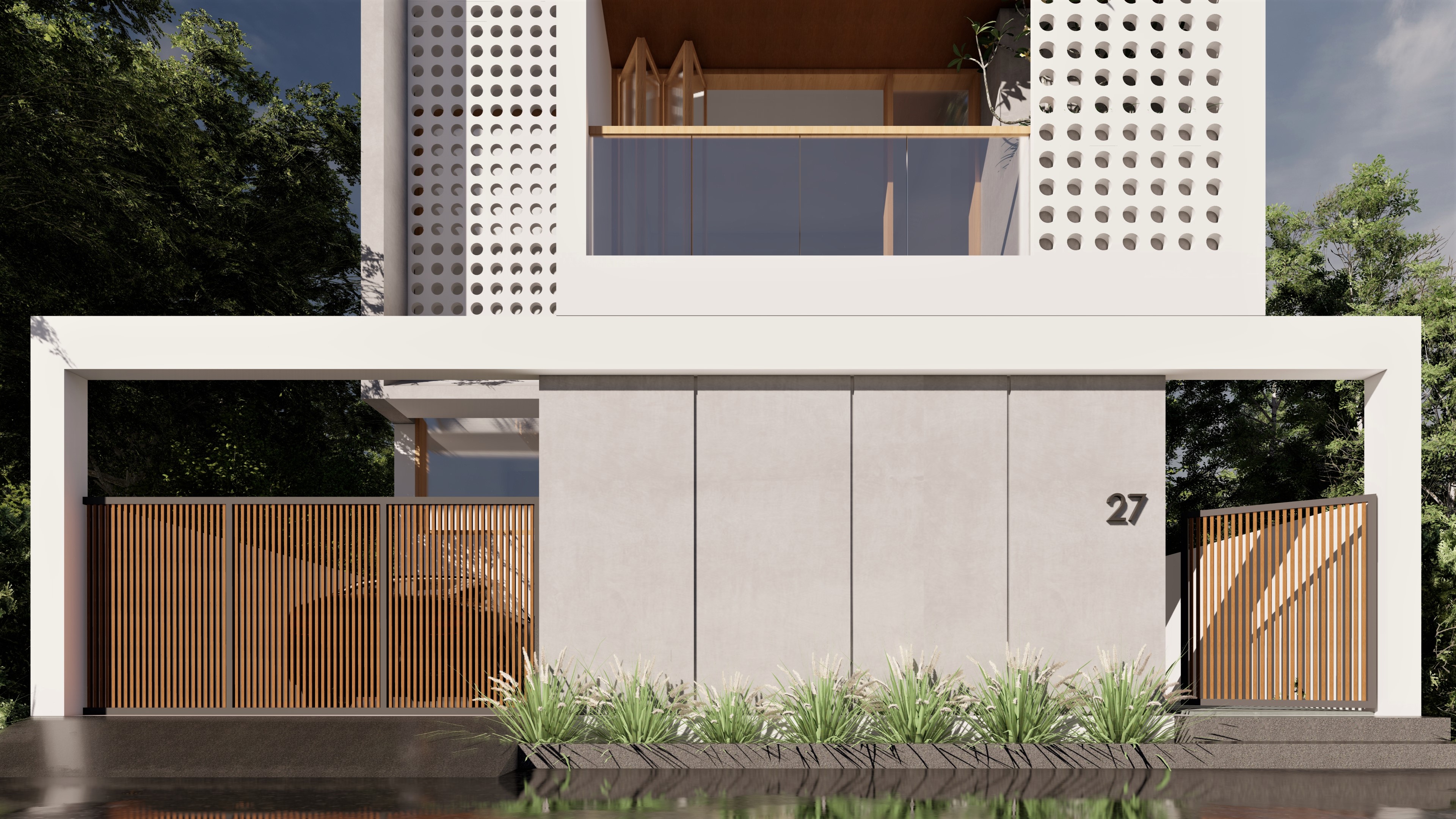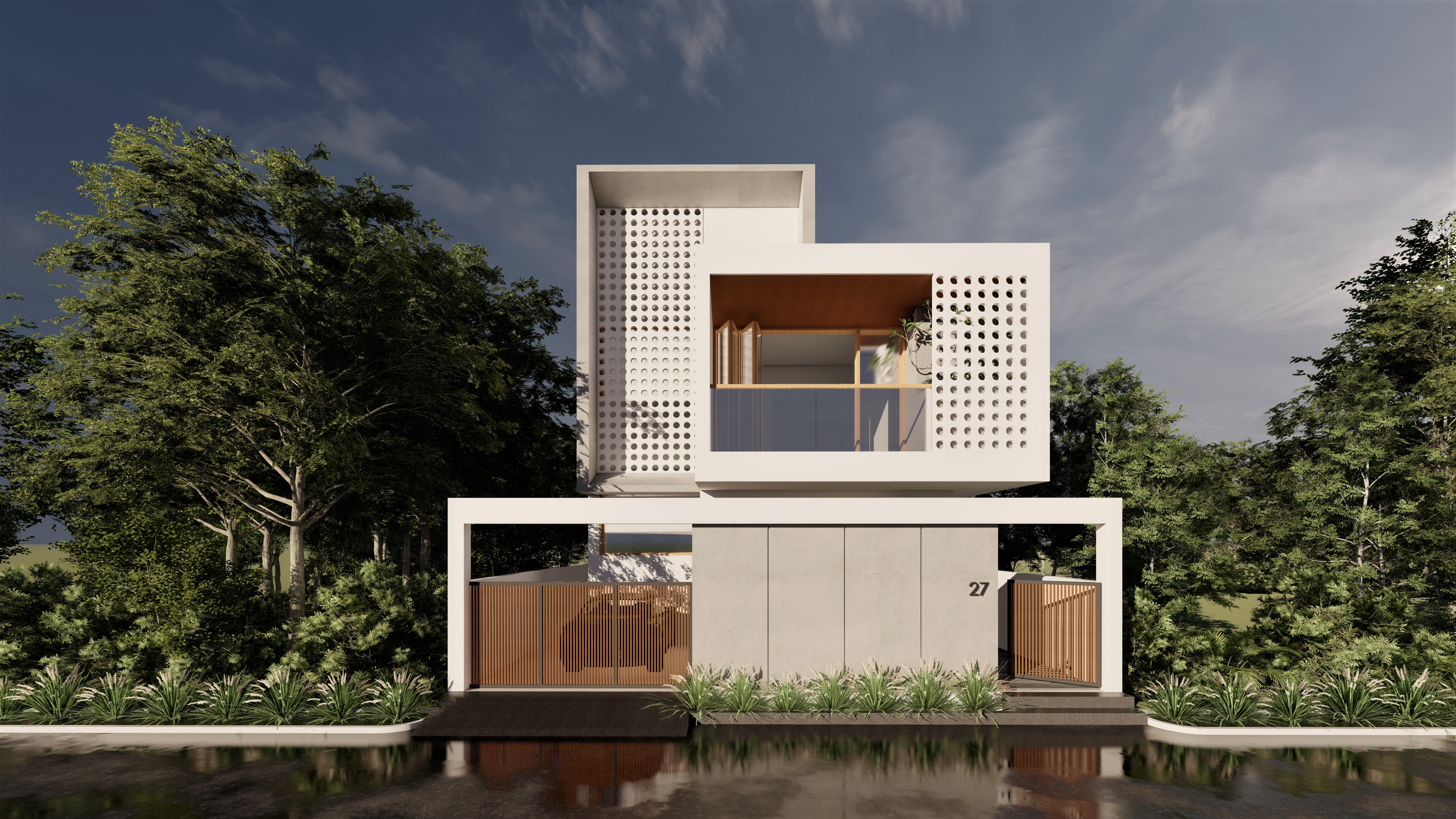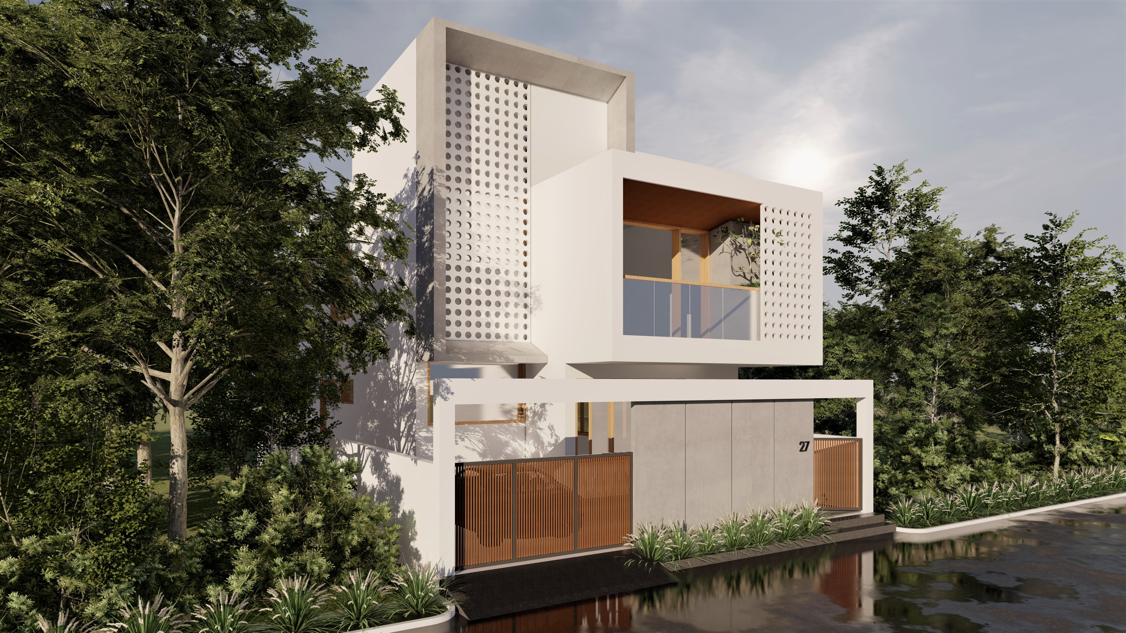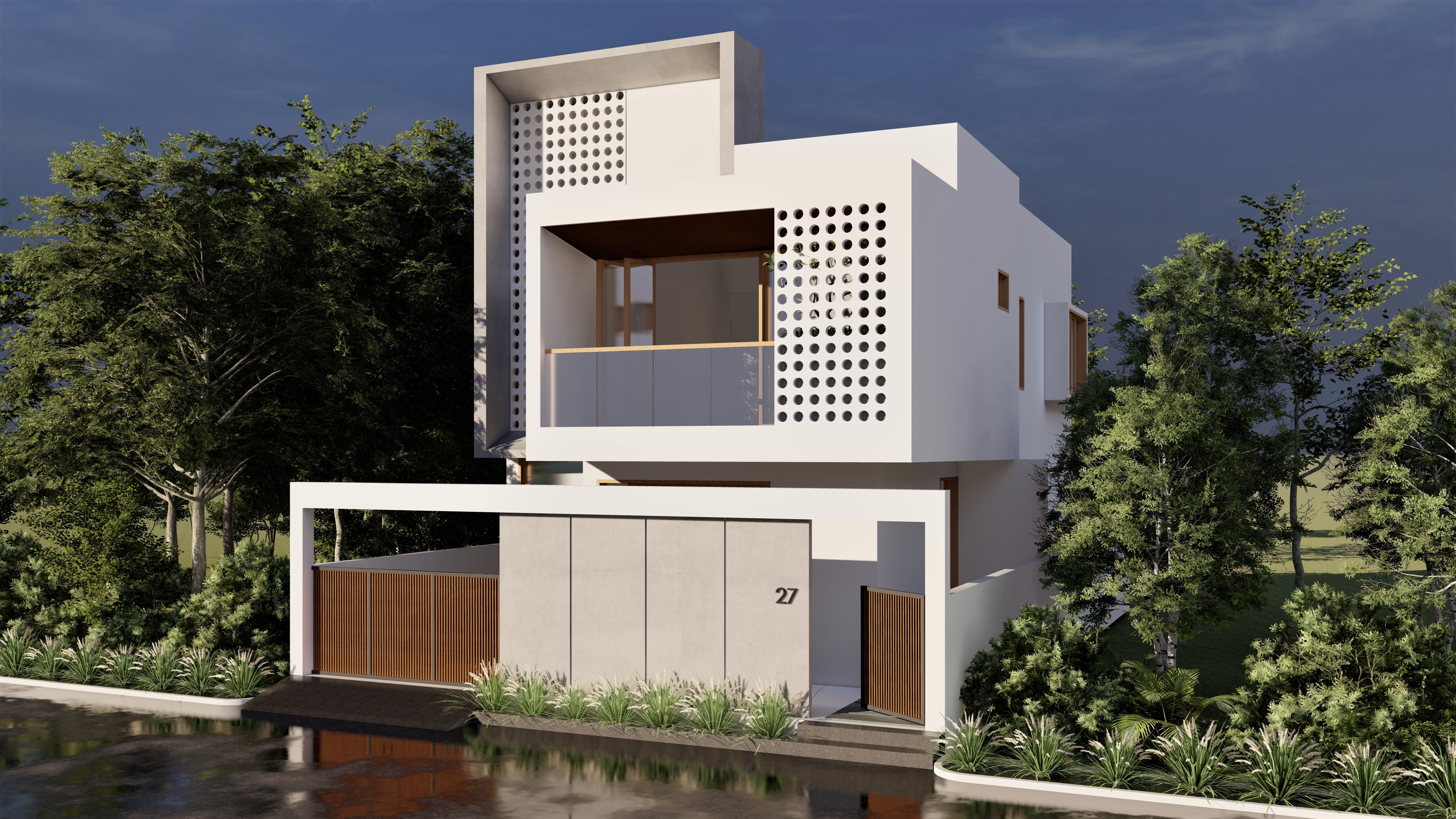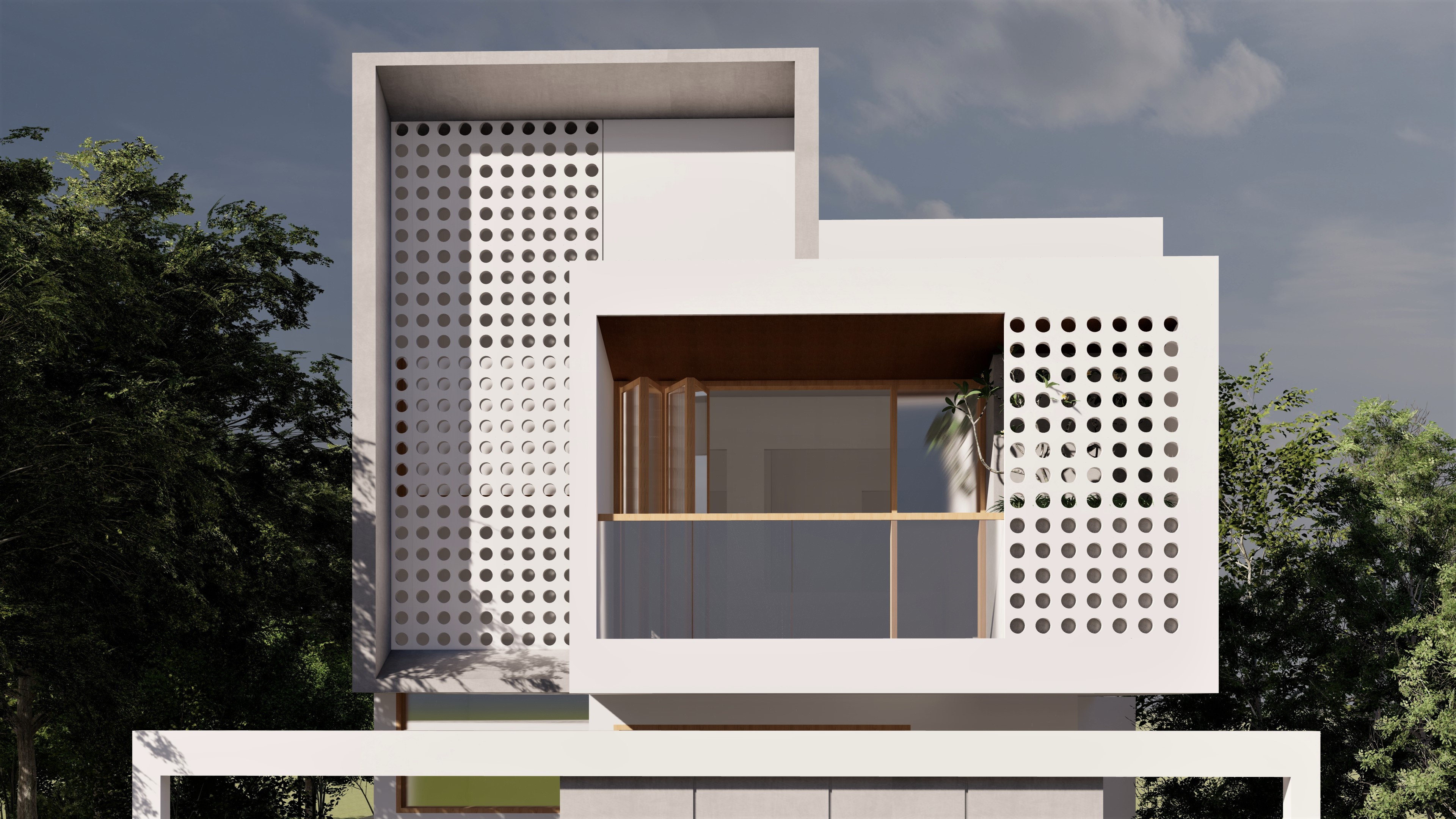 The exterior of the house features clean, straight lines that define its overall form. The facade isadorned with a white jaali screen. This intricate pattern adds a touch of elegance and visual interest to the façade, while also serving functional purposes such as providing shade, privacy, and allowing natural ventilation.