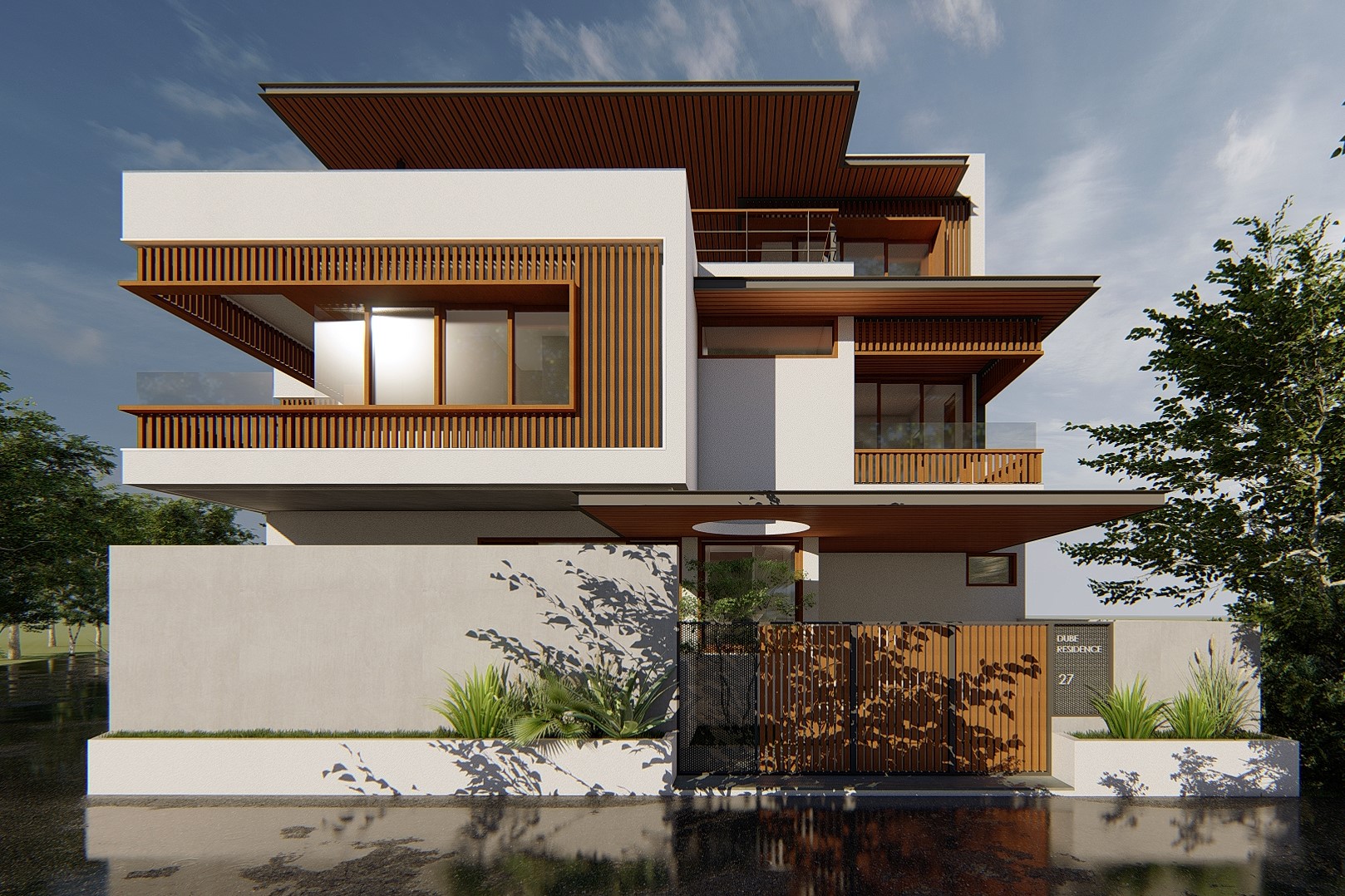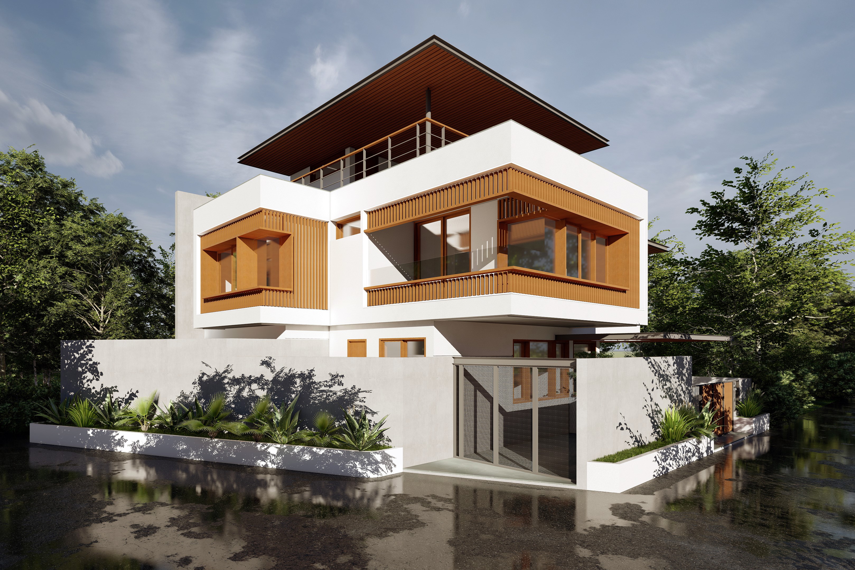 The structural elements that extend beyond the main body of the house, appearing to float in mid-air. The cantilever masses create a sense of drama and dynamic movement in the overall design. They are strategically positioned, projecting outward from different parts of the house, such as upper floors or balconies, providing both aesthetic appeal and functional benefits.