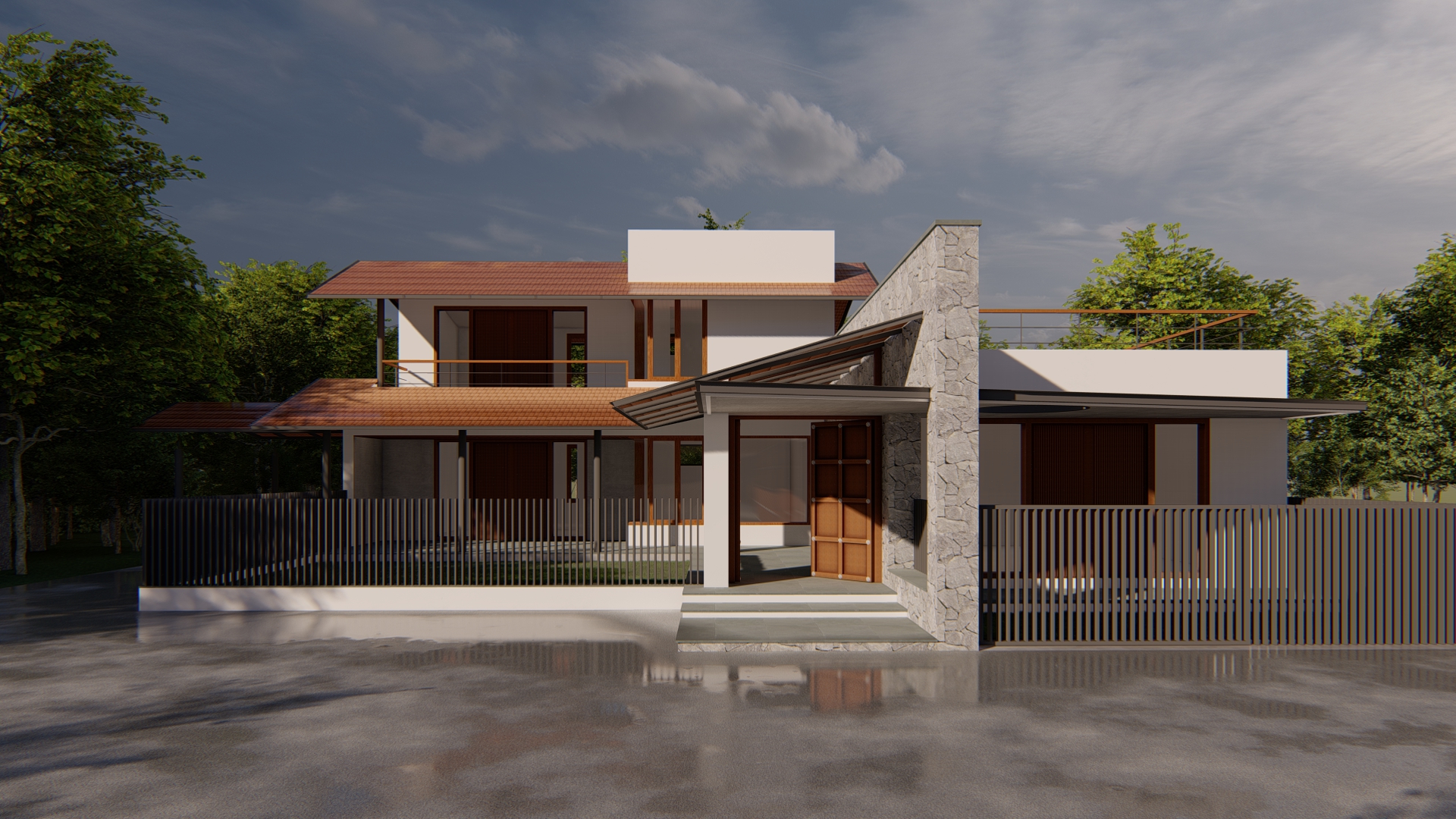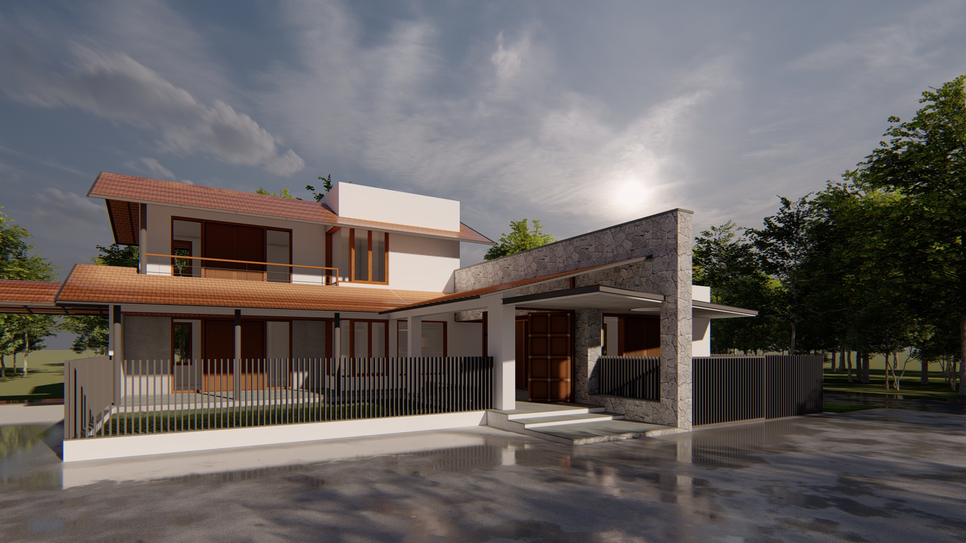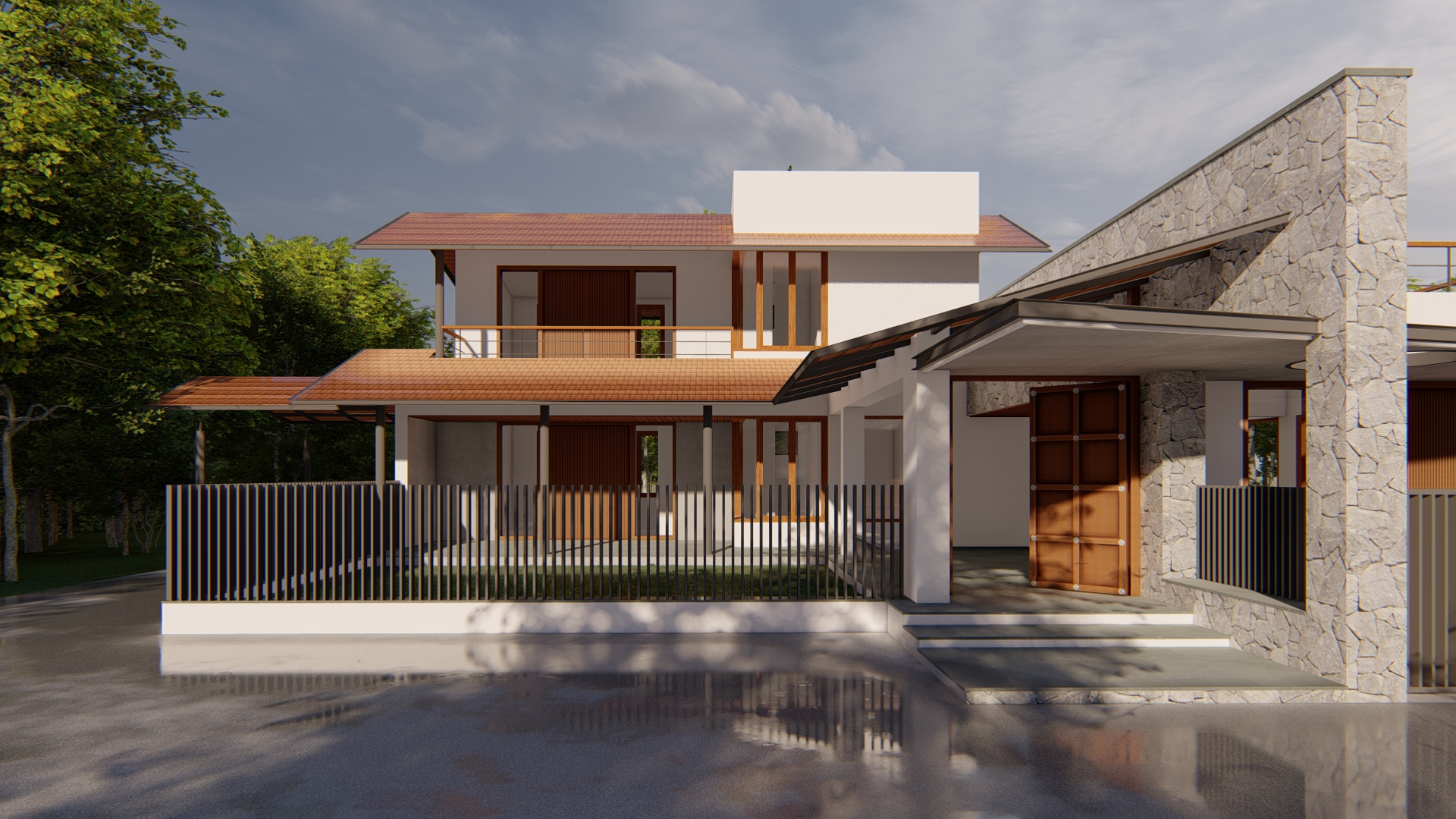 This charming house is a delightful fusion of traditional architectural elements and the beauty of nature, featuring a Mangalore roof and an exterior garden.